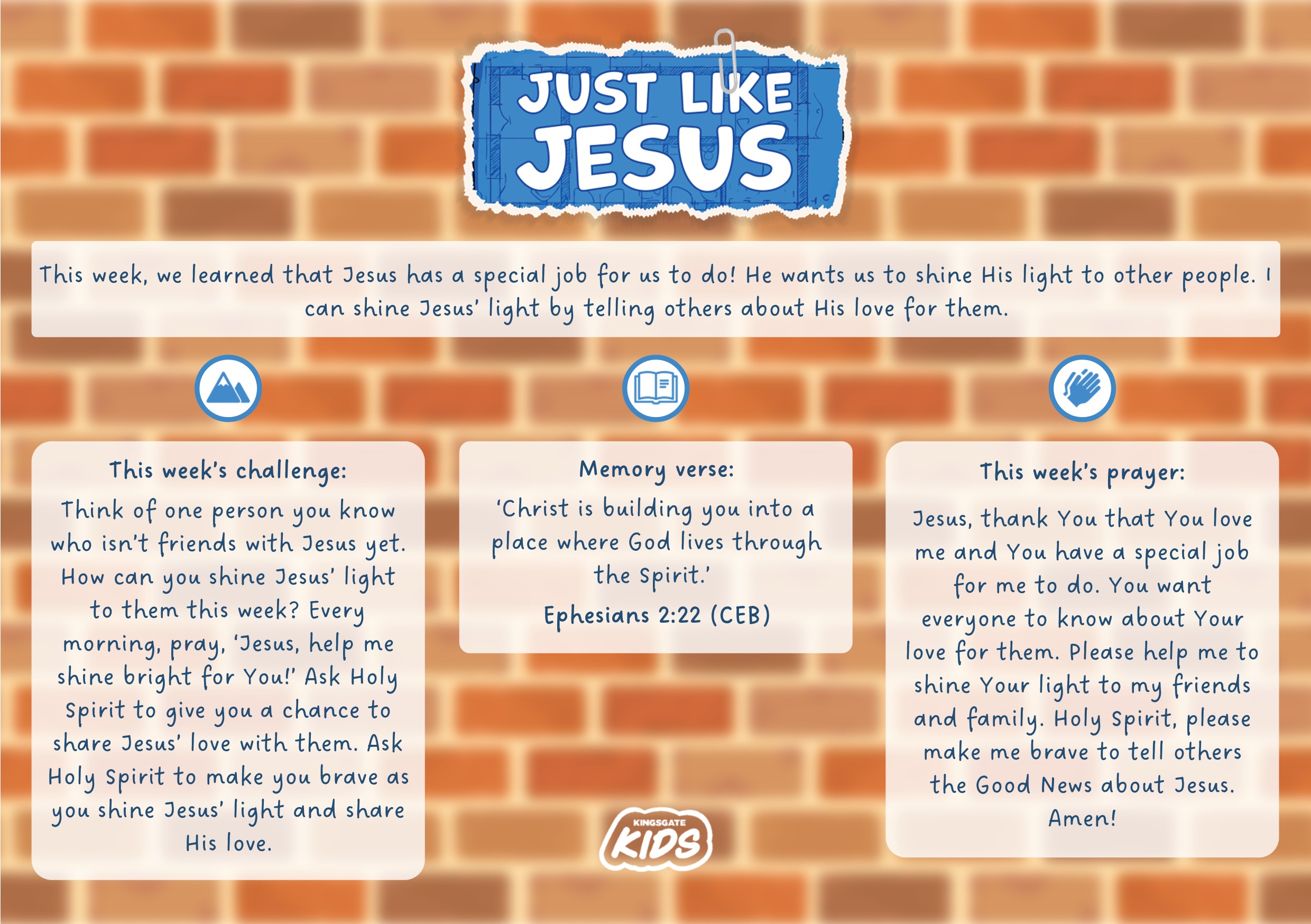 Jesus, thank You that You love me and You have a special job for me to do. You want everyone to know about Your love for them. Please help me to shine Your light to my friends and family. Holy Spirit, please make me brave to tell others the Good News about Jesus. Amen!