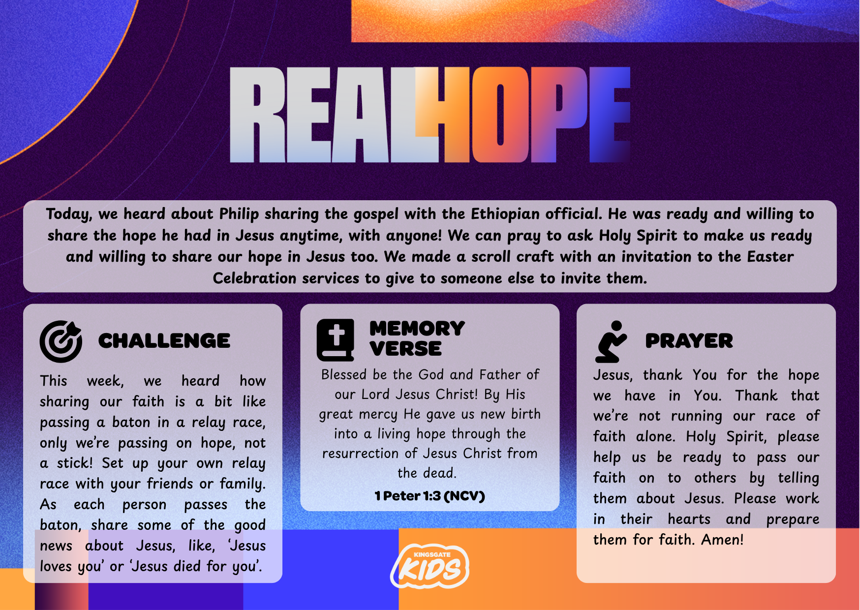 Jesus, thank You for the hope we have in You. Thank that we’re not running our race of faith alone. Holy Spirit, please help us be ready to pass our faith on to others by telling them about Jesus. Please work in their hearts and prepare them for faith. Amen!